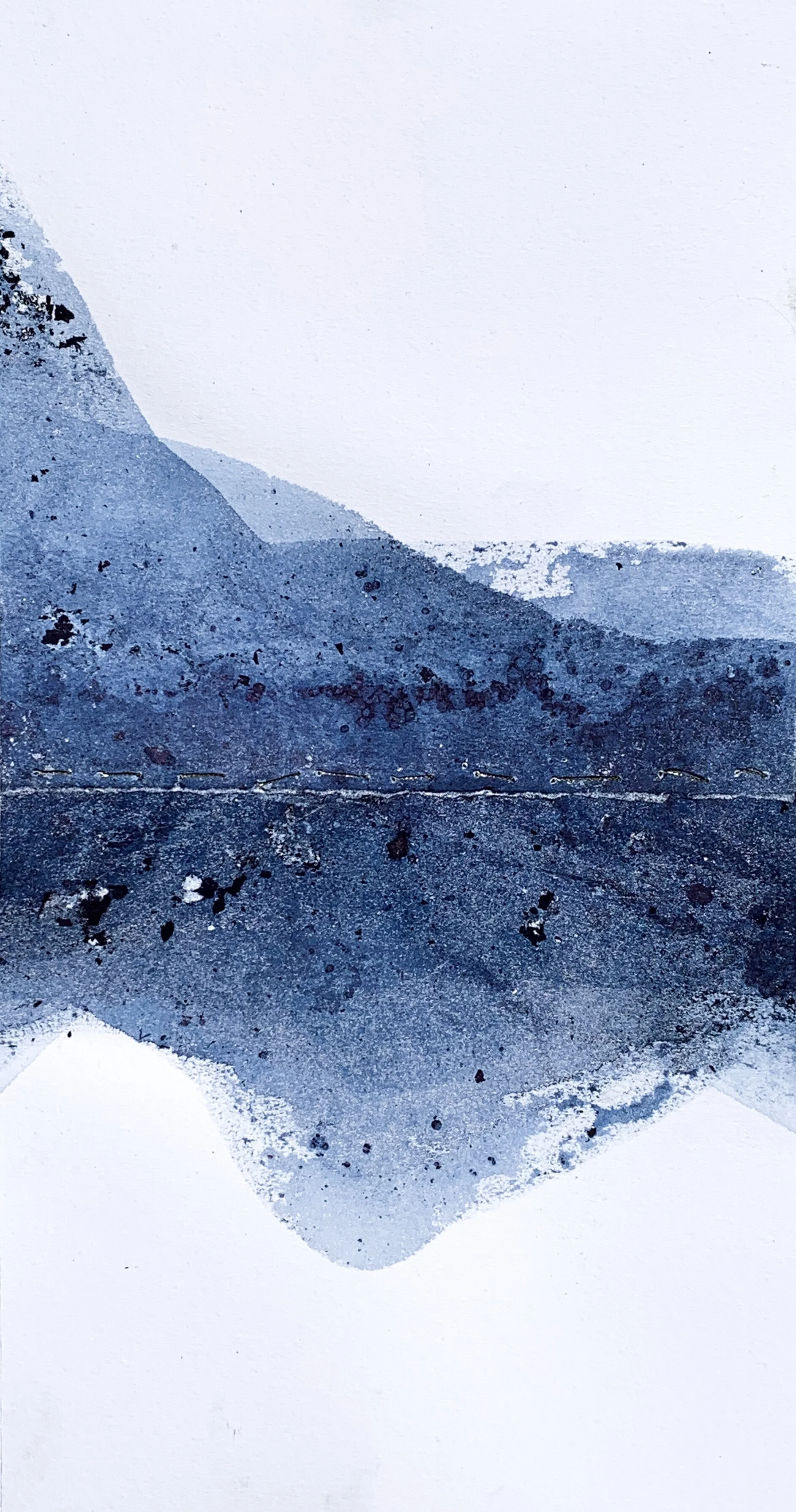 While a slight deviation from the works on paper, Dusk was a piece I created in 2016 that was one of my first experiments with indigo dye and other dyes on canvas. The piece literally made itself in my studio, as I poured pigment and let it sit over the course of many days. Once I felt happy with the result, I finished the piece by gold leafing the edges to heighten that feeling of dusk or golden hour. When the piece is lit from above, the gold emanates on the sides to create a larger glowing expanse.